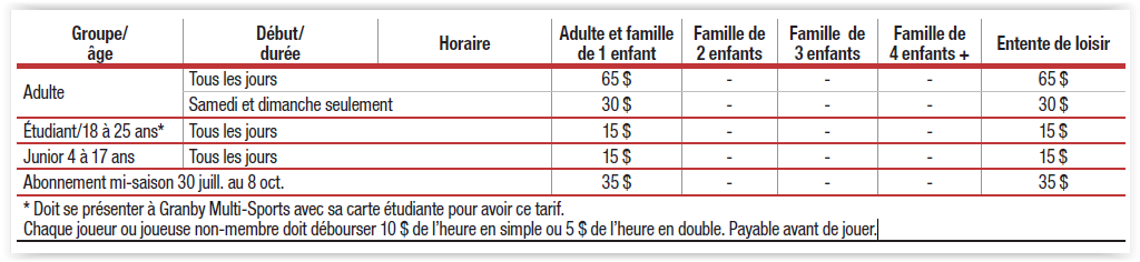 | ABONNEMENT DE SAISON La carte de membre de Tennis Granby donne accès aux 12 terrains de tennis durant toute la saison estivale sans frais supplémentaire de réservation de terrains. Durant la saison, plusieurs activités sont organisées pour les membres. La carte de membre est obligatoire pour s’inscrire à des ligues adultes. Chaque abonnement adulte donne droit à recevoir un invité gratuitement une fois dans la saison. Les juniors de 17 ans et moins obtiennent leur abonnement GRATUITEMENT s’ils s’inscrivent à un cours! |